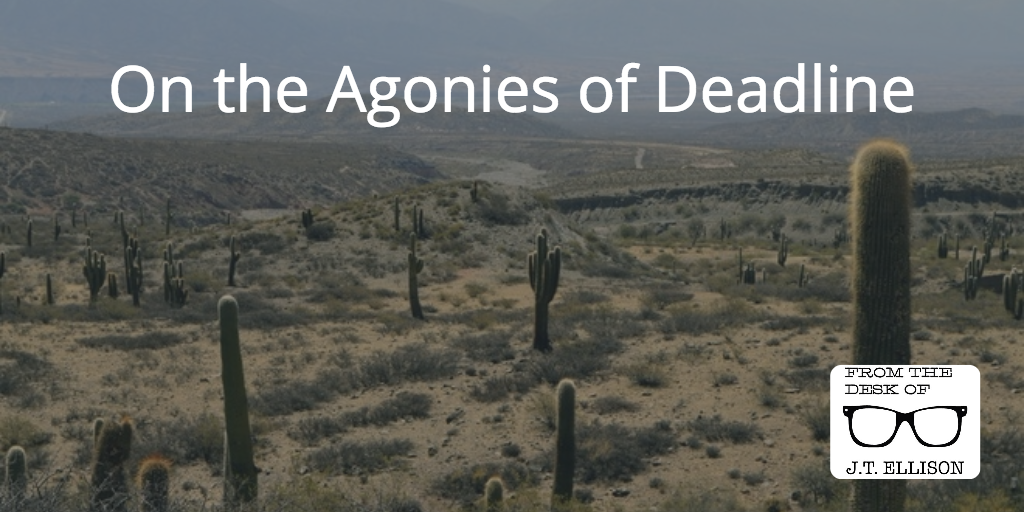 I hate to miss deadlines. I’ve actually only missed one, and that was by two weeks. Not bad. Deadlines are a point of pride with me. I will cut off my arm to make one. It’s something I learned about myself early on, back in high school, and I’ve never lost it. Which is a good skill to have, but it can get me in trouble sometimes.